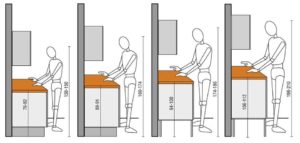Jak już  jesteśmy przy określaniu miary należy zastanowić się jaka wysokość szafek będzie dla nas odpowiednia. Jeśli masz 180 cm, nie będziesz stał przy szafce wysokiej na 85 cm, bo takie kiedyś były standardy 😉 Poniższy rysunek (znaleziony w necie) przedstawia odpowiednią wysokość szafek do  wzrostu.