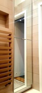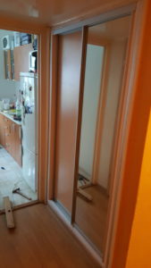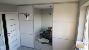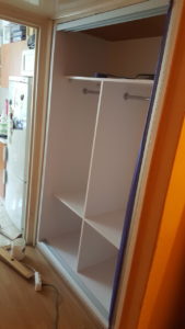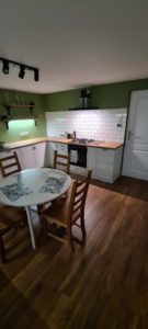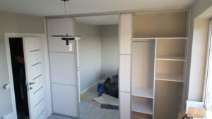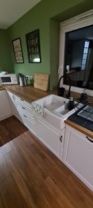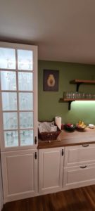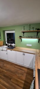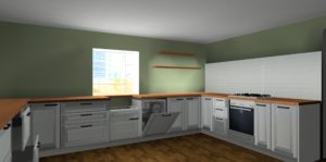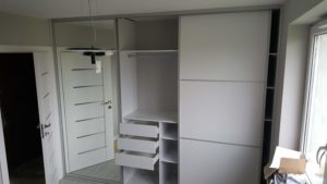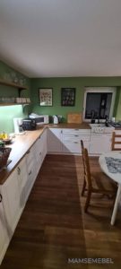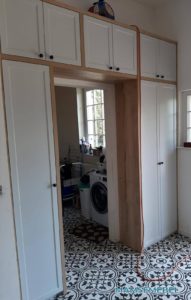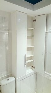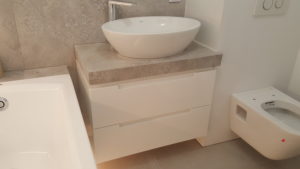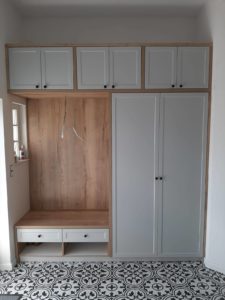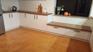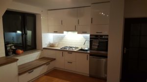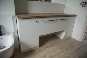 ŁAZIENKA SZAFY KUCHNIE – fronty frezowane – lakier mat – RAL 9003 – blaty i półki – dąb pradawny 1035 Biała z siedziskiem – lakier RAL 9003 połysk, – blaty dąb sherman koniakowy – egger